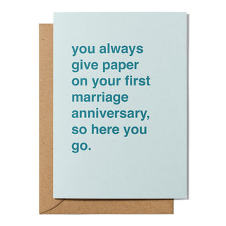 "You Always Give Paper on Your First Marriage Anniversary" Anniversary Card